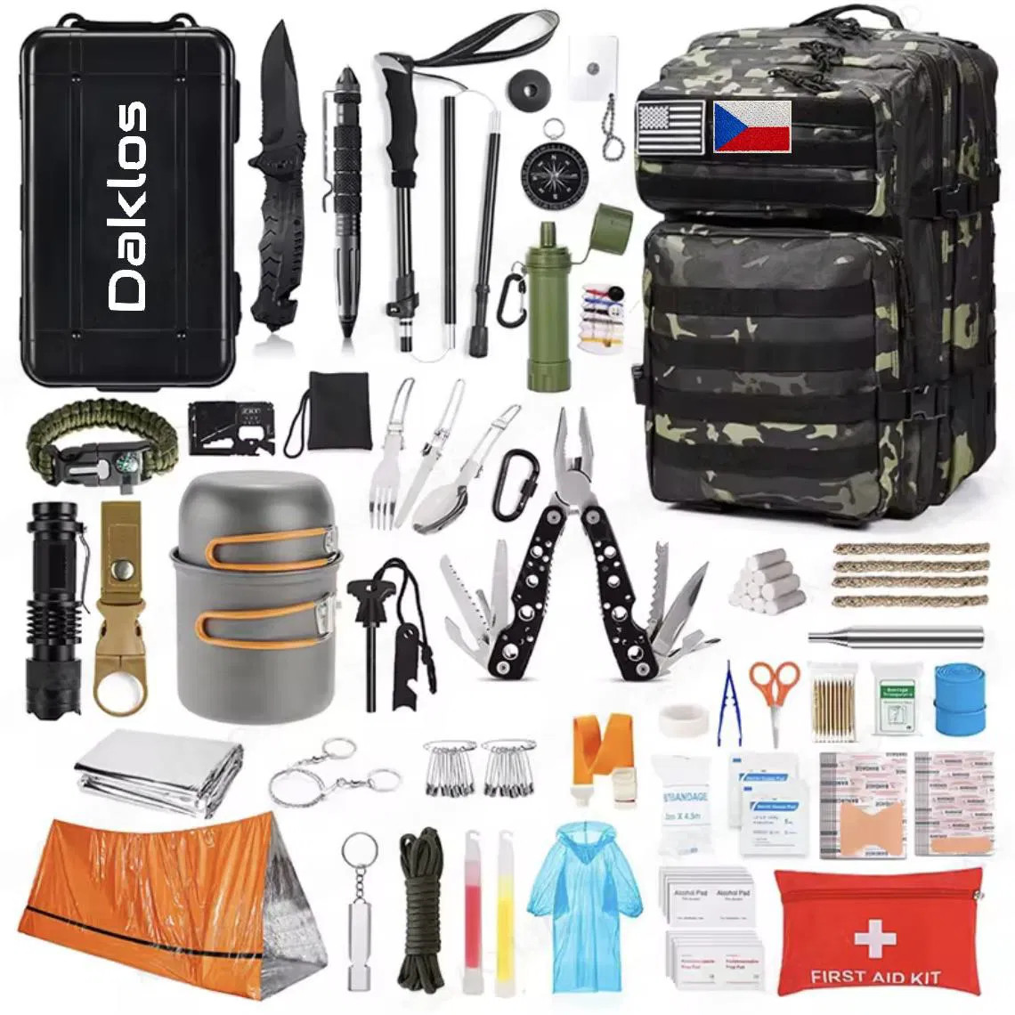 The STANDARD Emergency Backpack contains essential items for 24-hour survival. The 70-liter backpack includes: